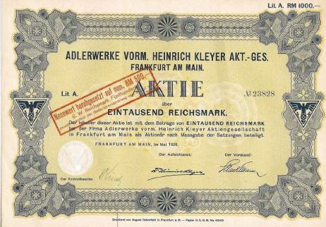 Aktie der Adlerwerke vorm. Heinrich Kleyer AG von 1929 über 1000 Reichsmark.