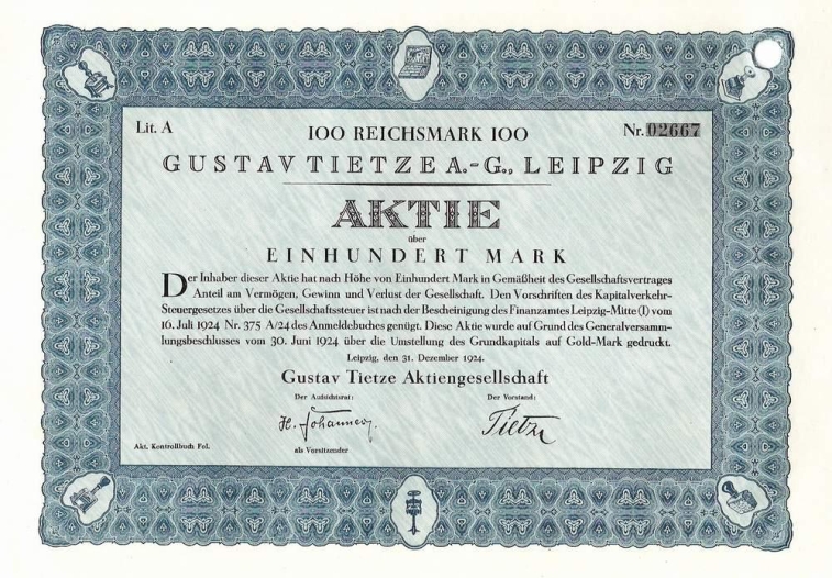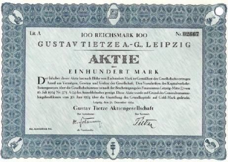 Aktie der Gustav Tietze AG von 1924 über 100 Reichsmark.