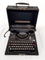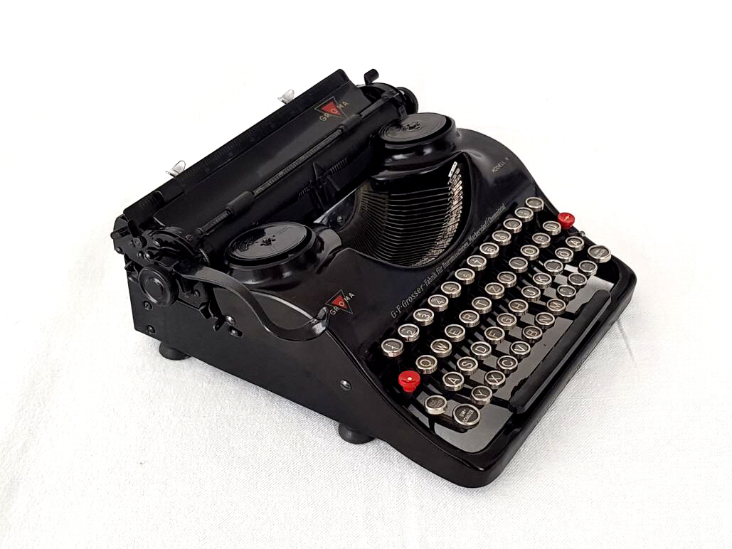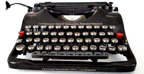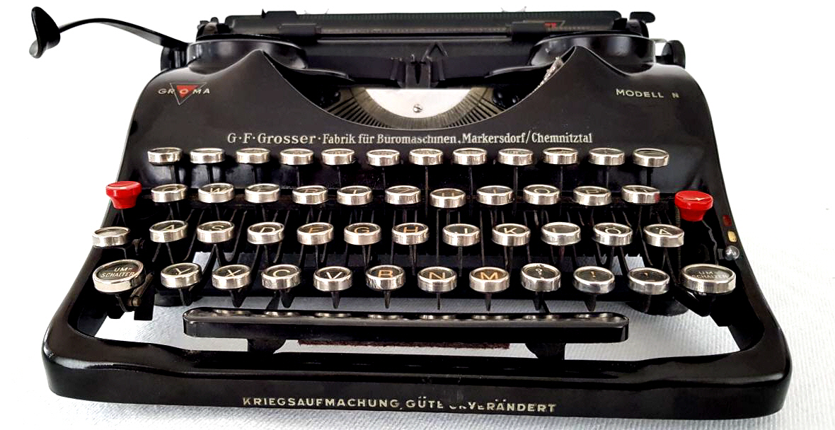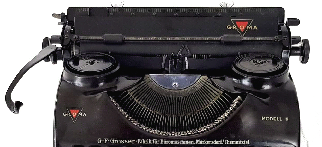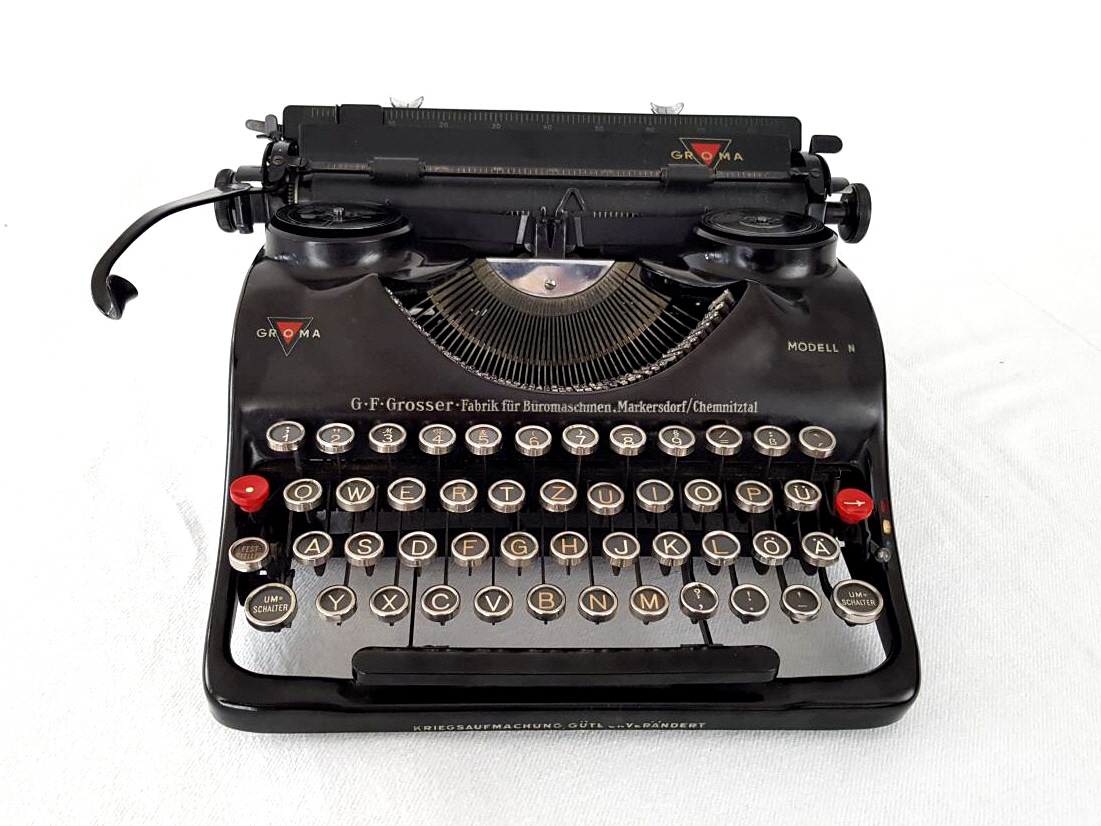 Während des Zweiten Weltkriegs (1939-1945) hatte die Rüstung Vorrang vor der Produktion von Schreibmaschinen. Besonders Metall musste zu Gunsten der Rüstung eingespart werden, auch bei Schreibmaschinen. Die hier vorgestellte "Groma N" entstand in 1944, also im vorletzten Kriegsjahr und trägt am vorderen Rahmen die Aufschrift "Kriegsaufmachung, Güte unverändert". Insbesondere an den Armaturen am Wagen wurde erkennbar gespart. Sie waren nicht mehr wie bisher verchromt, sondern jetzt schwarz lackiert.
