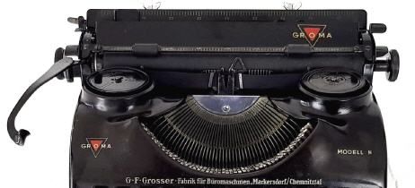 Maschinendaten: Bezeichnung: Groma Modell N Technik: Typenhebelmaschine mit Vorderaufschlag und einfacher Umschaltung Besonderheiten: Vereinfachte "Kriegsaufmachung" Erscheinungsjahr: Hersteller: G. F. Grosser, Fabrik für Büromaschinen, Markersdorf/Chemnitztal Konstrukteur: Leopold Pascher Seriennummer: 248694 Baujahr: 1944