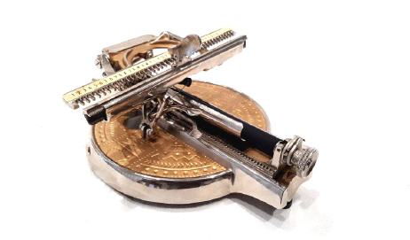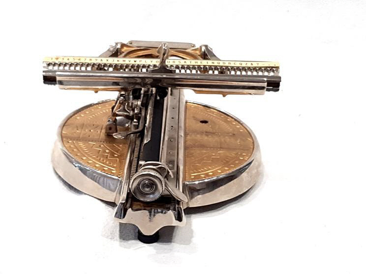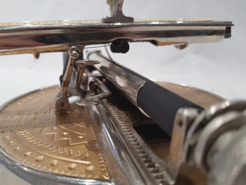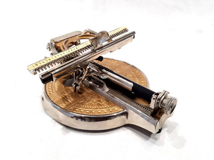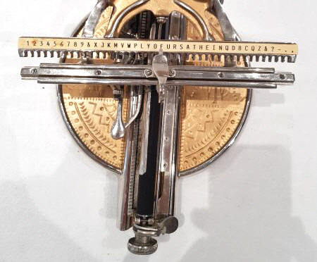 Das gewünschte Zeichen wurde mit einem Zeiger auf einer auf der Druckvorrichtung befindlichen, mit Einkerbungen versehenen Skala durch Schieben der Typenstange nach links oder rechts ausgewählt und beim Niederdrücken des Zeigers, der gleichzeitig als Schreibtaste diente, im Oberaufschlag zu Papier gebracht. Als weitere Taste war links der Schreibwalze noch eine Leertaste vorhanden.