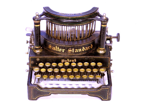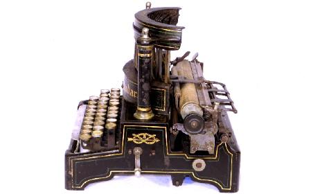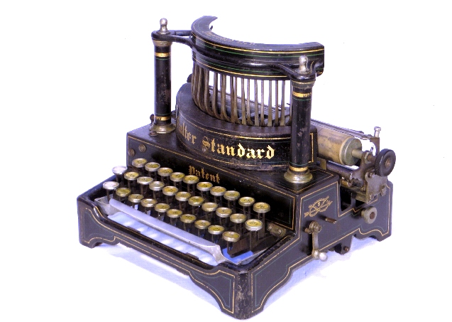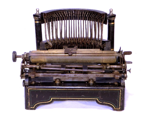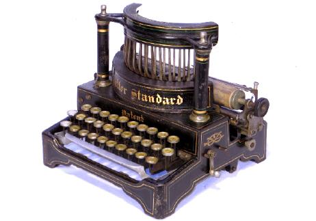 Englische Schreibmaschine mit aufrecht stehenden Typenhebeln.
