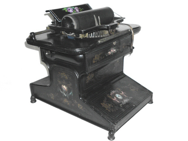 Die ersten Maschinen waren auf einem Nähmaschinentisch montiert und hatten ein Pedal, mit dessen Hilfe mit dem Fuß durch einen Seilzug die Wagenrückführung erfolgte (Abbildung rechts).