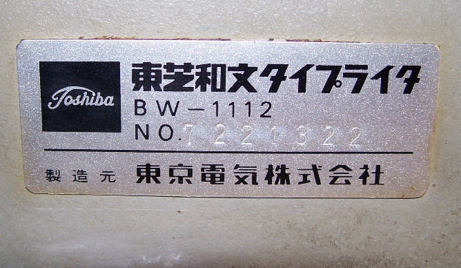 Maschinendaten: Bezeichnung: Toshiba BW-1112 Technik: Eintastermaschine mit Vorderaufschlag und Farbröllchen-Einfärbung Besonderheiten: Trommel mit 36 Typenstreifen mit insgesamt 1400 Schriftzeichen Erscheinungsjahr: 1940 Hersteller: Tokyo Shibaura Denki (Tokyo Electric Co. Ltd.), Tokio, Japan Konstrukteur: Seriennummer: 7221322