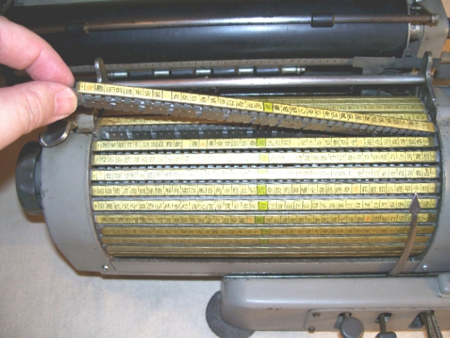 Die hier vorgestellte Maschine vom Typ "BW-1112" war mit 1.400 Schriftsymbolen ausgestattet. Sie befanden sich als einzelne Lettern aus Metall auf 36 austauschbaren Typenstangen ("Typenstreifen"), die jeweils 39 Typen in einer Reihe enthielten.