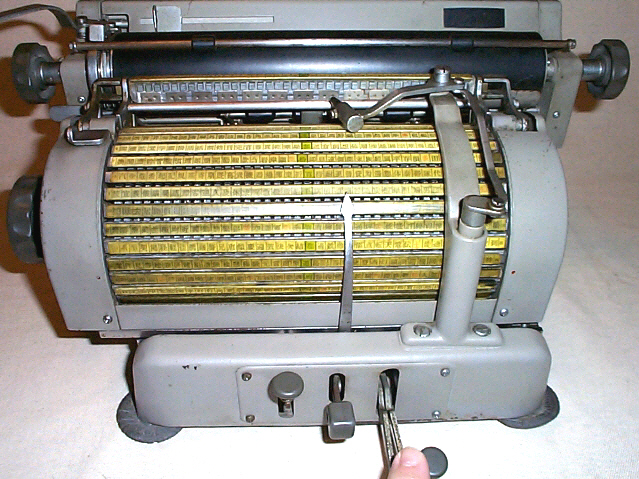 Zum Schreiben wurde zunächst das gewünschte Zeichen ausgewählt. Zu diesem Zweck wurde die Typentrommel entsprechend gedreht und nach rechts oder links bewegt, so daß der Zeiger auf das gewünschte Zeichen deutete. Dann wurde die Schreibtaste betätigt. Beim Tastenanschlag wurde der Typenstreifen, der das gewählte Zeichen enthielt, vor der Walze angehoben und mit dem Anschlaghammer die entsprechende Type im Vorderaufschlag an die Walze geschlagen.