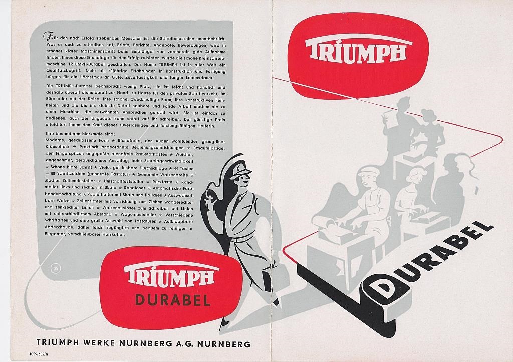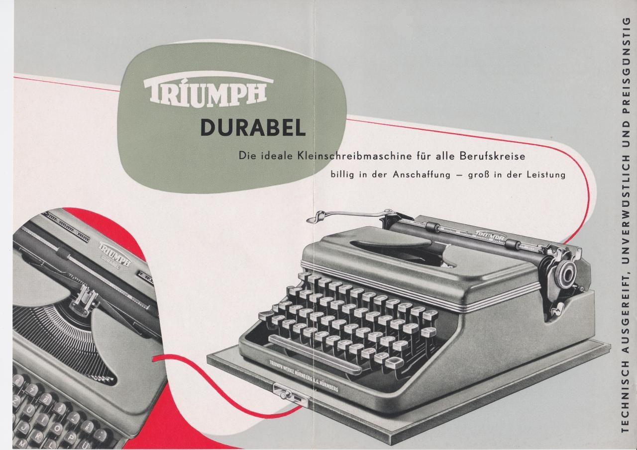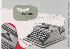 Die "Triumph Durabel" wurde von der "Triumph Werke Nürnberg AG" in Nürnberg erstmals 1933 hergestellt (Kurzabriß der Unternehmensgeschichte der Triumph-Werke siehe unter "Triumph"). Die "Durabel" war das einfachere Modell unter den Triumph Kleinschreibmaschinen. Sie hatte z.B. nur ein einfarbiges Farbband und besaß lediglich einen einzigen Walzendrehknopf und keinen Walzenstechknopf. Die hier vorgestellte, modernisierte Version mit Kunstharzgehäuse kam nach dem Zweiten Weltkrieg um 1951 auf den Markt und wurde für 345 DM verkauft. Die Maschine konnte sowohl als Portable als auch als leichte Büroschreibmaschine verwendet werden.