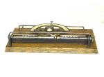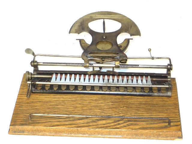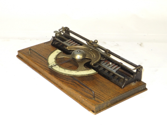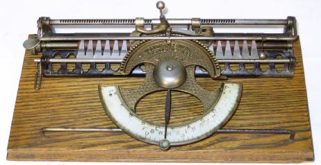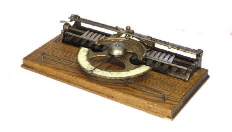 Die Maschine hatte eine halbkreisförmige Zeichenskala, die auf einer Metallplatte angebracht war. Darüber war eine ebenfalls halbkreisförmige drehbare, mit einem Zeiger versehene Messingscheibe gelagert, an deren Unterseite eine Kautschukplatte mit den Typen angebracht war. Die Messingscheibe hatte über jeder Type eine entsprechende kleine Bohrung.
