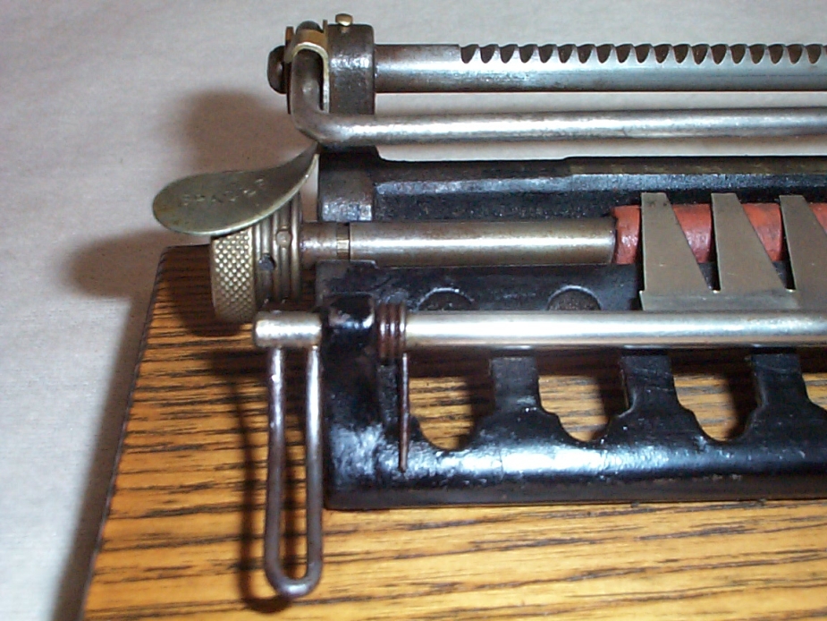 Nach Einstellung des gewünschten Zeichens mit dem Zeiger, drückte man auf einen beweglichen Bügel, wodurch ein kleiner Stift in die zum gewählten Zeichen gehörende Bohrung eingeführt wurde. Dadurch wurde die darunterliegende Type am Druckpunkt fixiert und von einem kleinen Bolzen auf das Papier gedrückt. Gleichzeitig wurde der gesamte Druckmechanismus von einer kleinen Klinke, die in die jeweils nächste Kerbe einer Zahnstange fiel, um eine Zeichenbreite nach rechts geschoben.