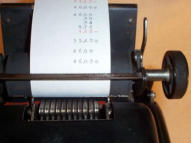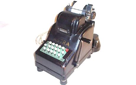 Pultaddiermaschine mit "Zwölfertastatur", mit Hand- und Elektroantrieb.
