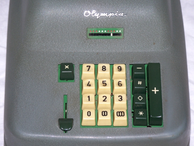 Diese Büro-Rechenmaschine mit Schiebewagen stammt von der Olympia Werke AG in Wilhelmshaven (Kurzabriß der Unternehmensgeschichte siehe unter Olympia Modell 7). Die Maschine kam Mitte der 1950er Jahre auf den Markt und wurde bis 1960 produziert.