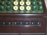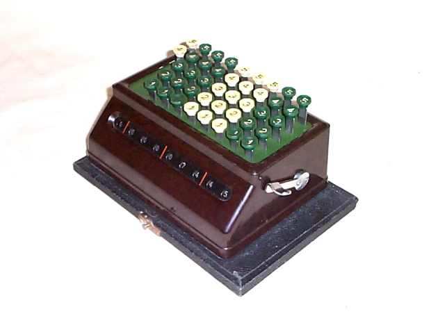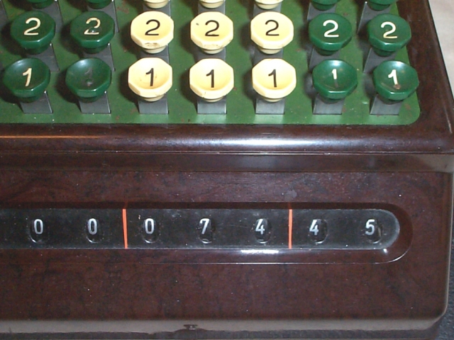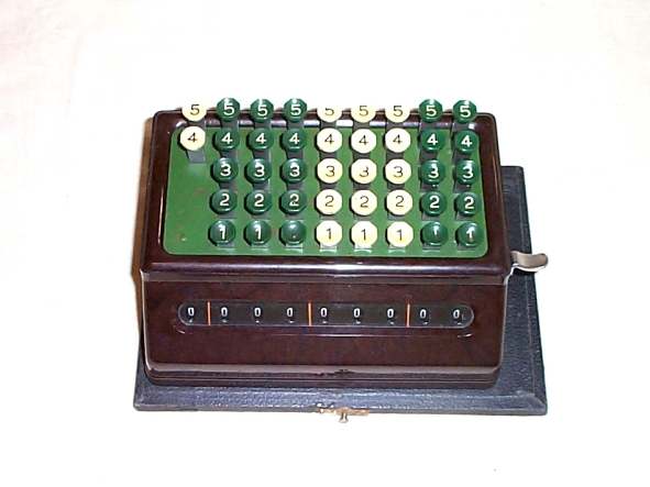 Kleine Tastenaddiermaschine, deren Tastatur nur die Ziffern 1-5 enthält.