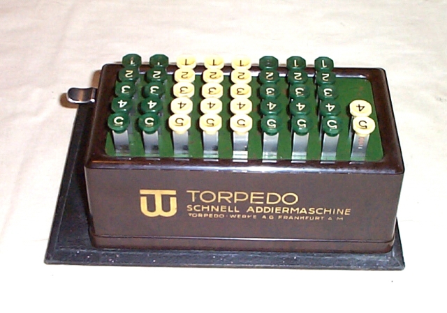 Die "Torpedo Schnelladdiermaschine" war die kleinste Tastenaddiermaschine ihrer Zeit. Das Tastenfeld enthielt nur die Ziffern 1 - 5 und war daher nur etwa halb so groß wie "Volltastaturen". Die Zahl 6 wurde durch zweimaliges Drücken der Ziffer 3, die Zahl 9 durch 4 und 5 addiert usw.