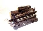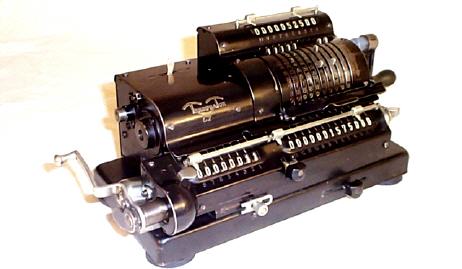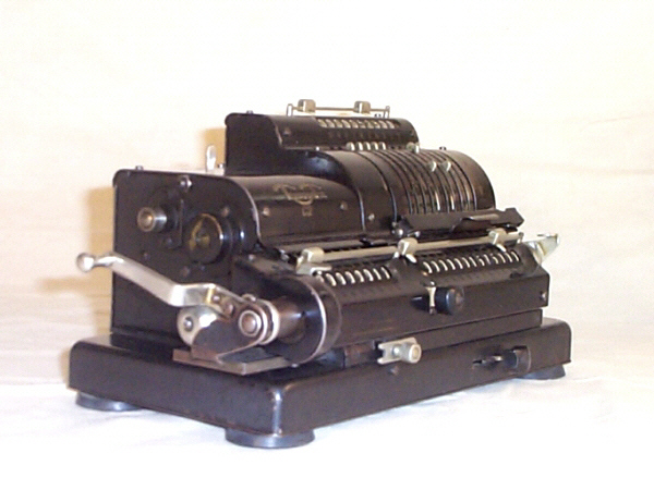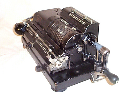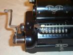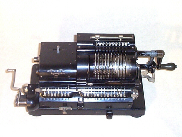 Sprossenradmaschine mit Einstellkontrolle und Zehnerübertragung in beiden Zählwerken.