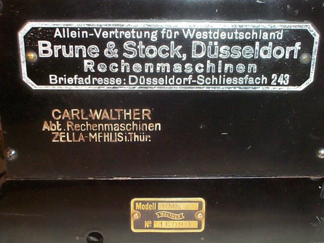 Maschinendaten: Bezeichnung: Walther RMK Technik: Sprossenradrechenmaschine Kapazität: (Stellen Einstellwerk/Zählwerk/Resultatwerk) 10 x 8 x 13 Erscheinungsjahr: 1931 (bis 1936) Hersteller: Carl Walther -Abt. Rechenmaschinen- Zella-Mehlis in Thüringen Seriennummer: 16099